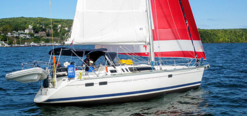The Hunter 40.5 was conceived as a comfortable cruising boat, and as in all Legend Series boats, a tough competitor too. She blends comfort, performance, and shorthanded sailing capabilities all in one package. Her powerful rig, swept back spreaders, and large mainsail enhance her performance, while the bulb-wing keel keeps her stable and shallow in draft. Special touches like a small furling headsail, single-line reefing, and full battened mainsail with lazy jacks, make cruising the 40.5 so enjoyable. A wide-open cockpit, complete with table keep you comfortable in a seaway or on the hook. Down below, there is an incredible salon finished in rich fabrics, hand-rubbed teak and Corian counters. The L-shaped galley is truly workable including a dual-opening refrigerator and freezer, stove with oven, and even a dish rack complete with dishes. Accommodations are sumptuous and can handle a crew of six or even eight with this tri-cabin version. The Hunter 40.5 boasts 17 opening ports and enough dry storage to comfortably live aboard. From the innovative walk-through transom to the stainless anchor roller, no one provides a better-equipped or a more value-oriented, comfortable cruiser than the Hunter 40.5.